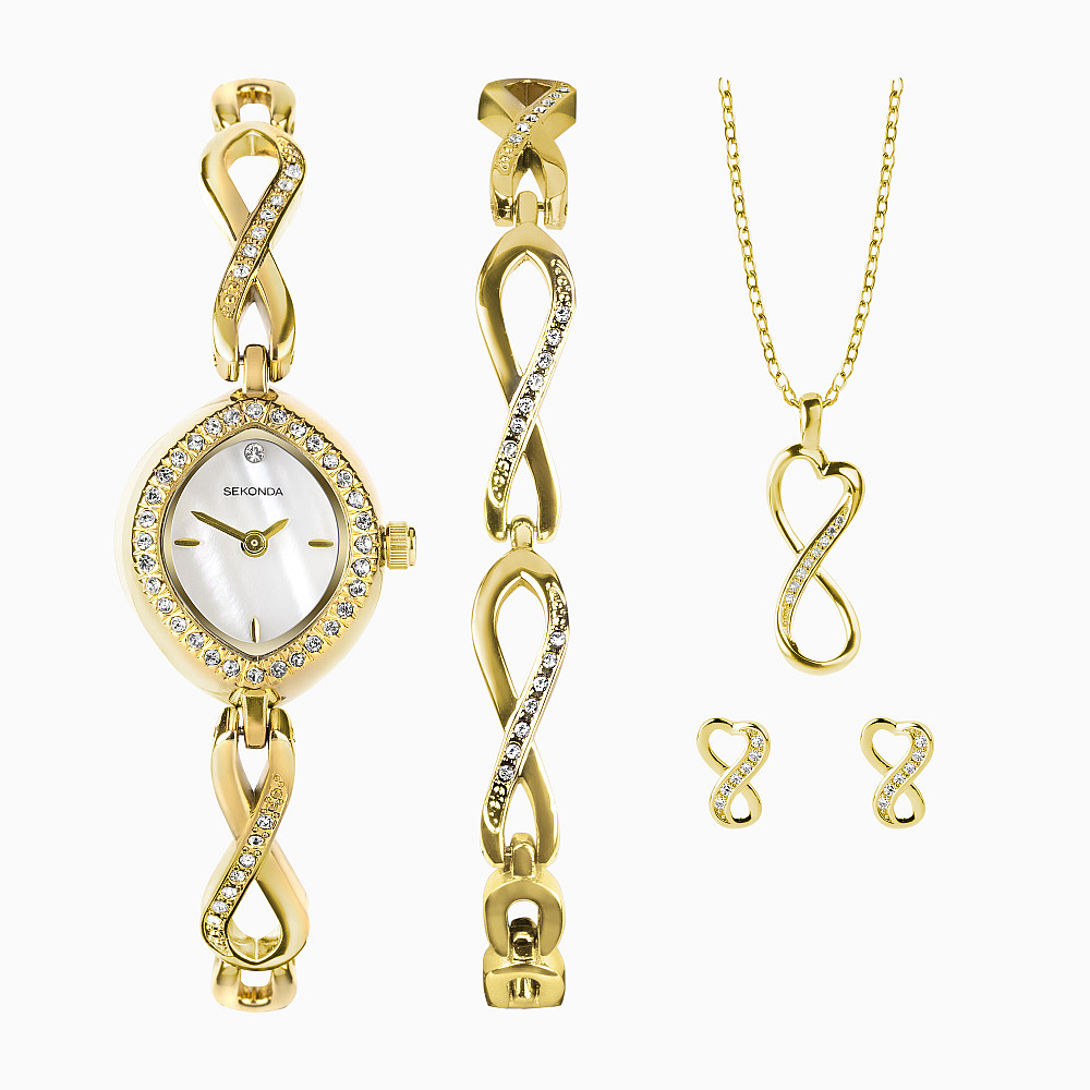 Комплектът включва: 1 бр. дамски часовник Sekonda, 1 бр. дамска гривна, 1 бр. дамско колие, 1 бр. чифт дамски обеци